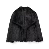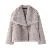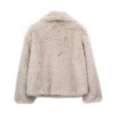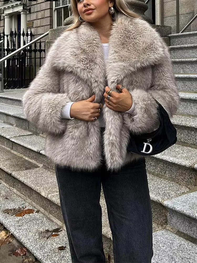 Women’s Cropped Faux Fur Jacket – Snap-Button Lapel Collar Winter Coat